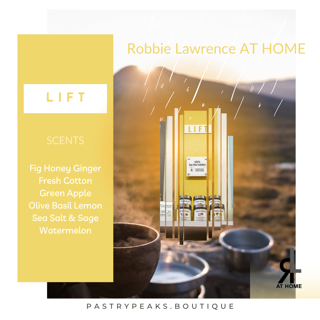 The Robbie Lawrence AT HOME LIFT collection are a blend of complex aromatics that create this refreshing and uplifting selection of soy-based scented candles.